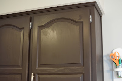 Once I did this step I was amazing at how much better the cabinets looked already. Not having to look at the worn away areas really gave the cabinets a much needed update, but we're not done yet. Continue on to finish the update.